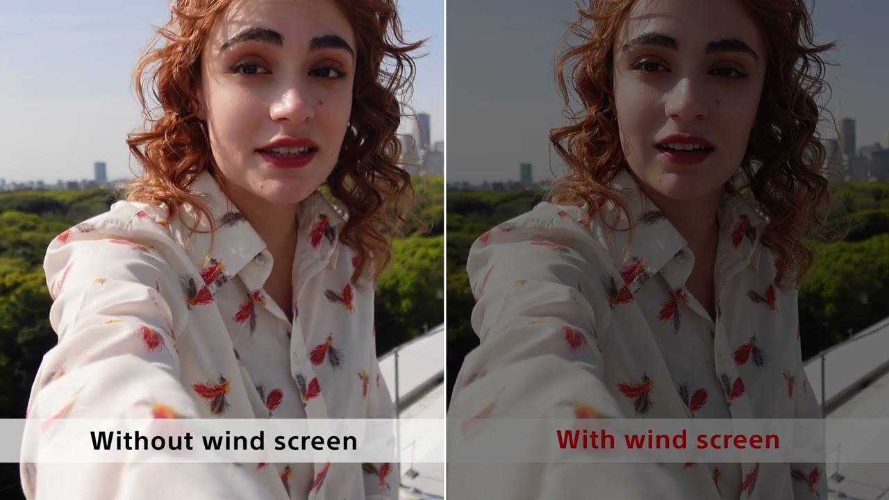 En el modo [Auto], el nuevo micrófono inteligente de 3 cápsulas incorporado cambia 0 de dirección de [All Directions] a [Front] cuando la cámara reconoce un rostro humano en el fotograma. O puedes cambiar manualmente a [Front] para selfies o [Rear] cuando grabes con narración. Fija el paravientos proporcionado para reducir el ruido y capturar audio más nítido en el exterior.